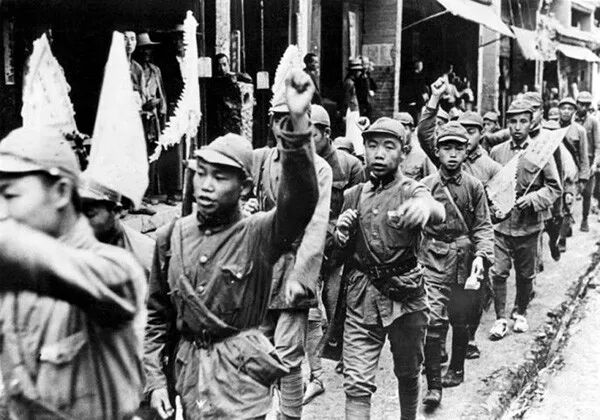 不少网友看他们戴的帽子误认为是日军,其实他们是红军, 1937年改编前陕北红军总部一些部队确实配发过这种帽子,与传统的红军八角帽确实不一样。