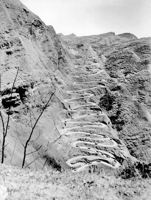 1945年,美国援华物资车队要攀爬的滇缅公路著名的“二十一道拐“。