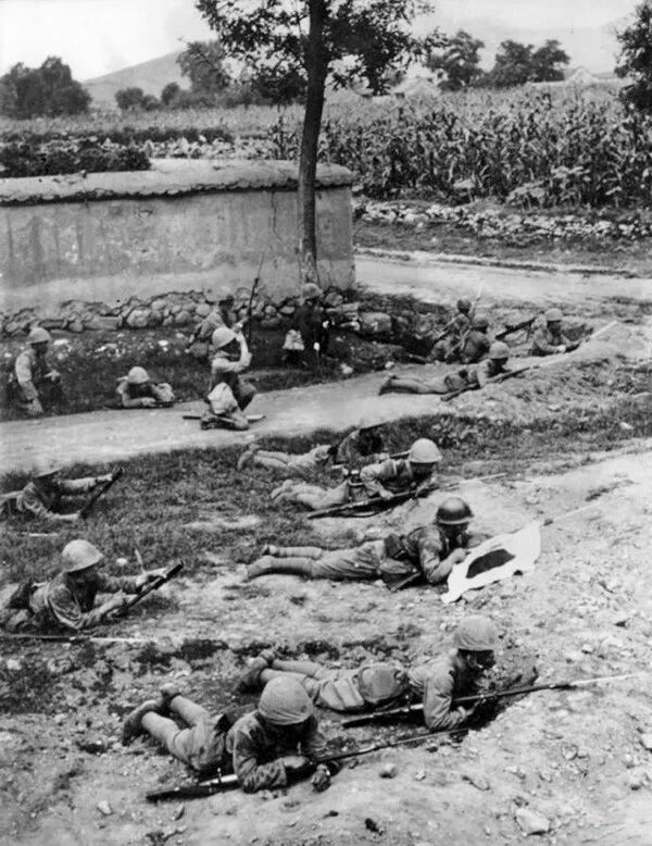 在中国城市郊区作战的日本陆战队,左边两个士兵操作89式50毫米掷弹筒。