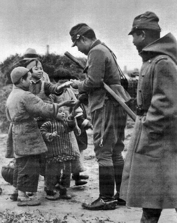 1937年,日本美化宣传,日军官发糖果给中国儿童。