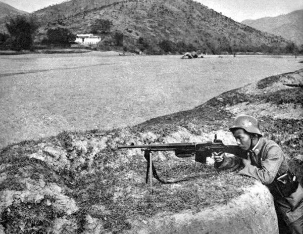 1939年,中国军队wz1928轻机枪的机枪手,他的装束是20世纪30年代德国士兵样式。