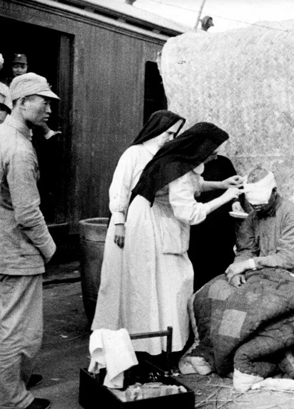 1938年,在中国军人监督下,两个修女包扎头部受伤被俘的日本士兵。