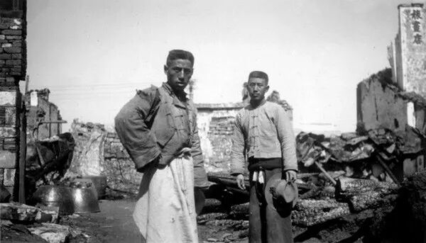 1938年,两名中国平民在南京他们的房屋废墟前。