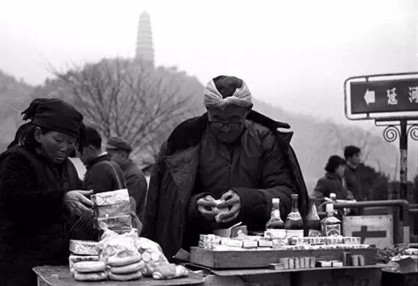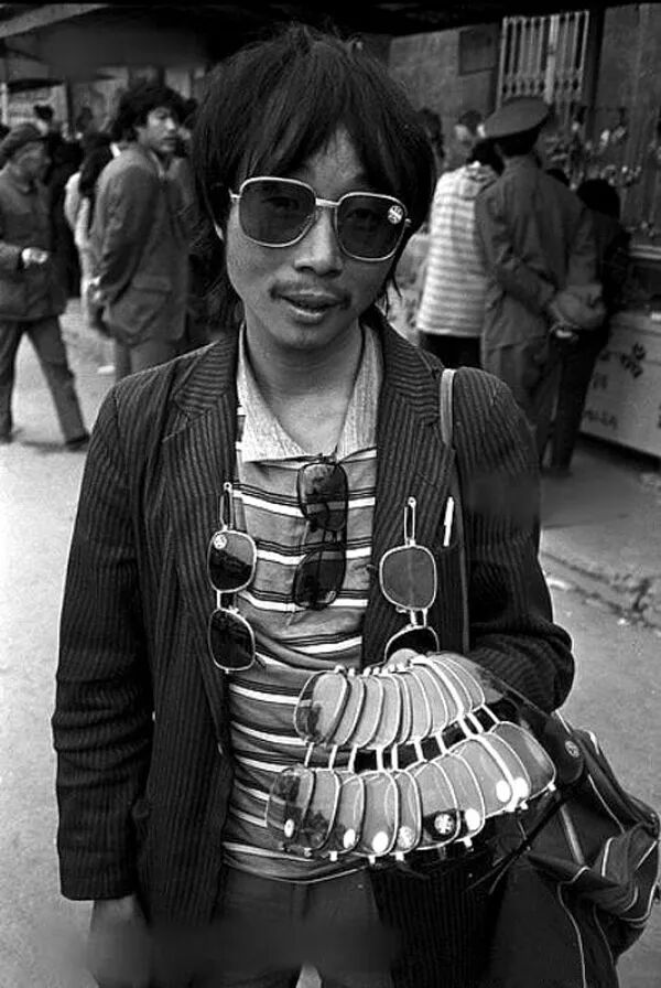 1987年,河南洛阳,卖眼镜的小贩。王文澜/摄。