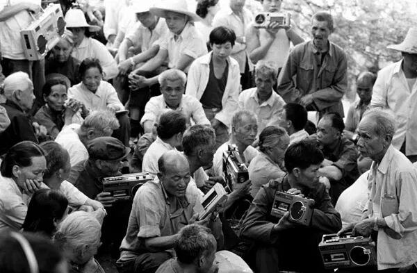 1988年,广西桂林赛歌会上,手拿卡带录音机的老人们。王文澜/摄。