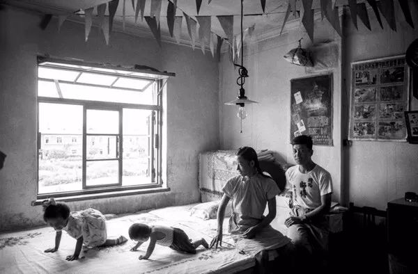 1956年,鞍山钢铁厂工人宿舍,钢铁工人和他的妻子、孩子。汤姆·哈金斯/摄。