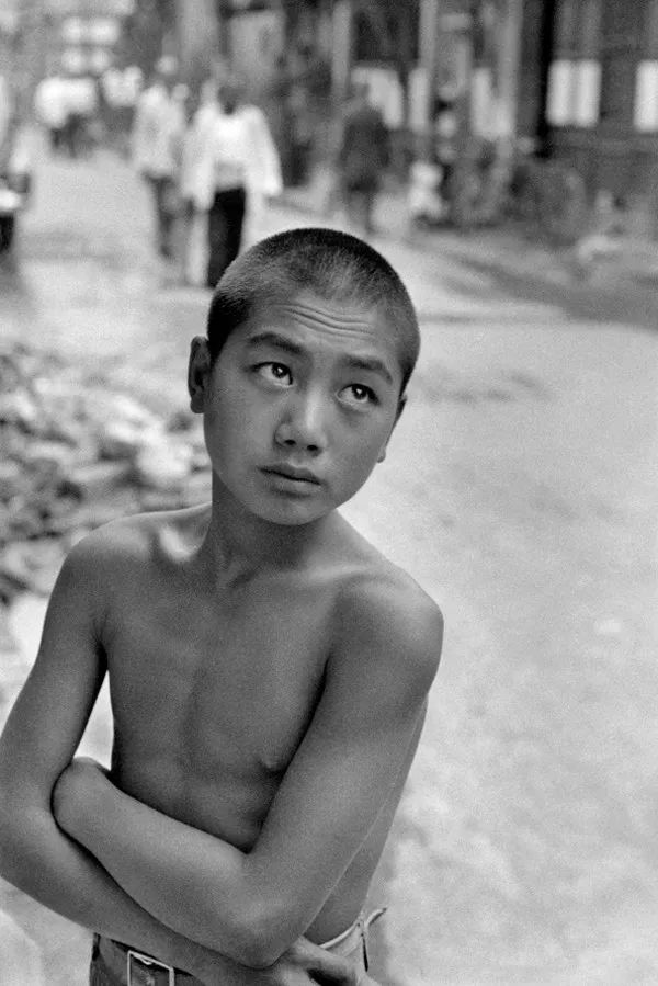 1956 年,北京琉璃厂,面带好奇神情的男孩。汤姆·哈金斯/摄。