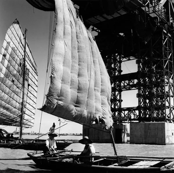 1956年,汉口,正在修建的武汉长江大桥下的帆船。汤姆·哈金斯/摄。