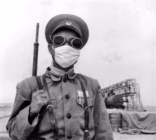 1956年7月,玉门油田,沙尘暴中全副武装的执勤军人。汤姆·哈金斯/摄。