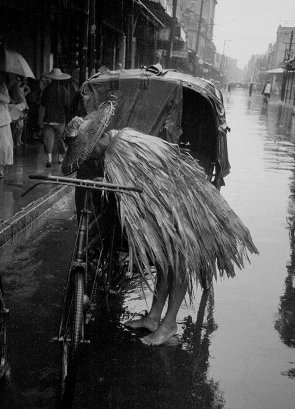 1956年,广州街头,一名戴斗笠穿蓑衣的车夫。汤姆·哈金斯/摄。