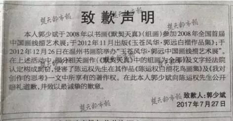 比如2012年11月,由四川美术出版社出版了一本名为《玉苍风华·郭远白描作品集》的画册。其中,郭远把《陈运权白描花鸟画集》中收录的71幅作品,居然一张不漏地全部照抄了一遍。甚至,《玉苍风华·郭远白描作品集》的前言,也几乎照搬照抄了陈运权原载于1991年1月号台湾《艺术家》杂志的《我对创作的思考》一文,全文只改动了十几个字。