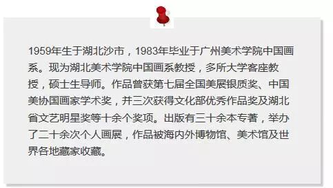 1959年生于湖北沙市,1983年毕业于广州美术学院中国画系。现为湖北美术学院中国画系教授,多所大学客座教授,硕士生导师。作品曾获第七届全国美展银质奖、中国美协国画家学术奖,并三次获得文化部优秀作品奖及湖北省文艺明星奖等十余个奖项。出版有三十余本专著,举办了二十余次个人画展,作品被海内外博物馆、美术馆及世界各地藏家收藏。