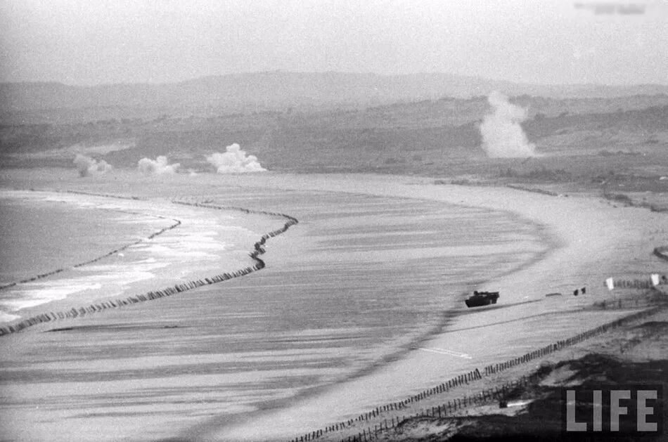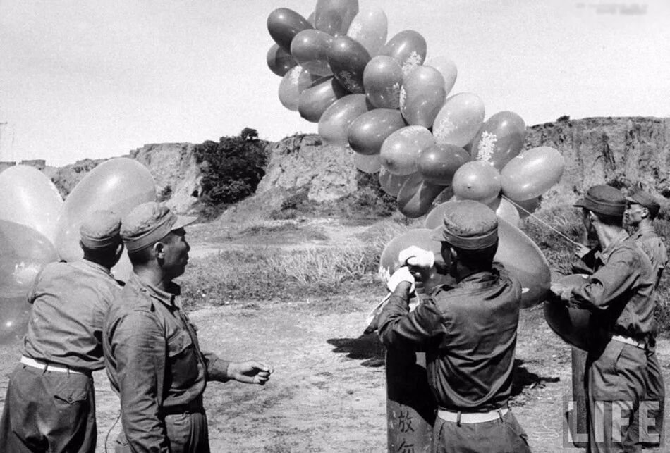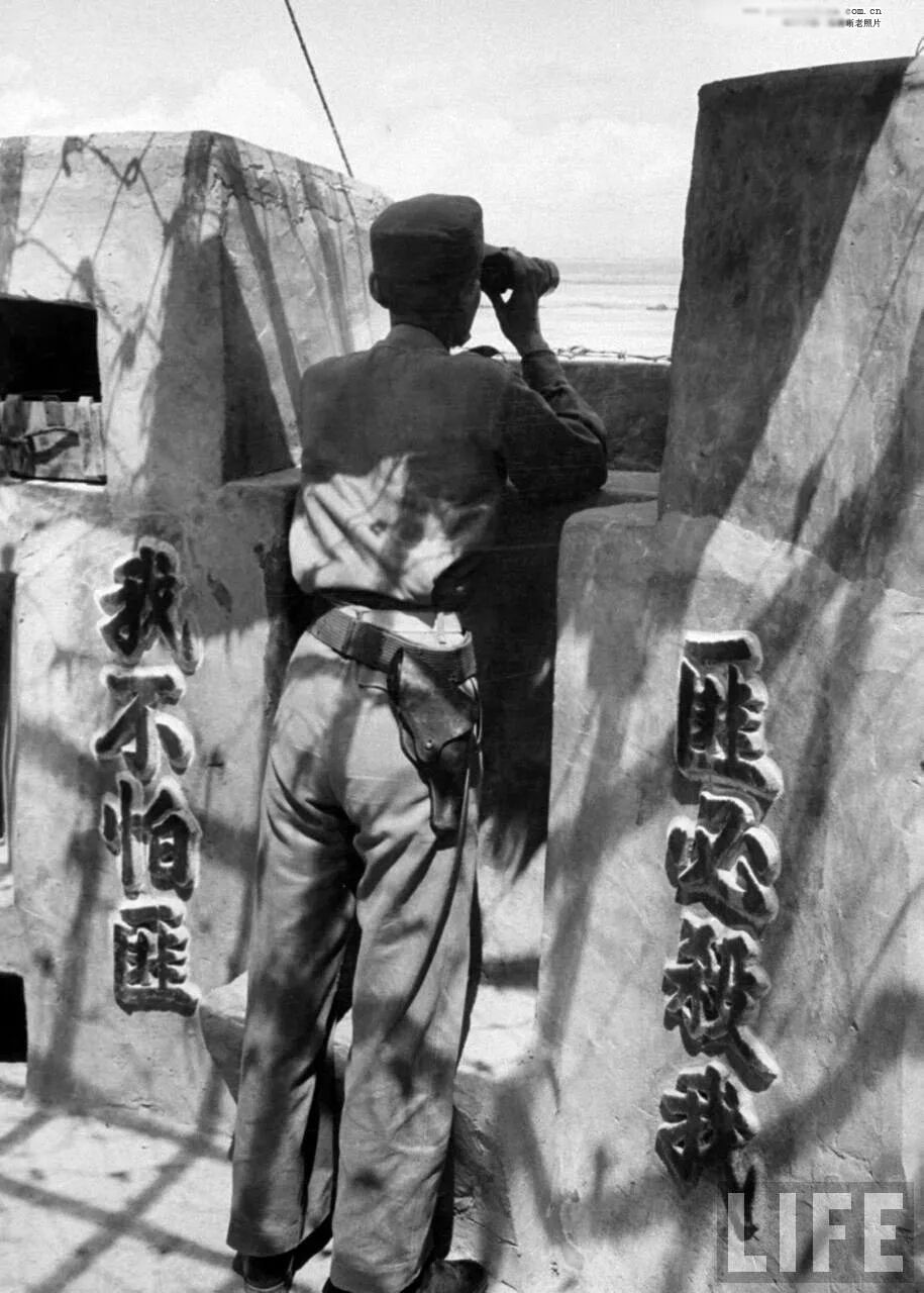国军士兵在金门岛填充沙包,来阻挡共军打过来炮弹。