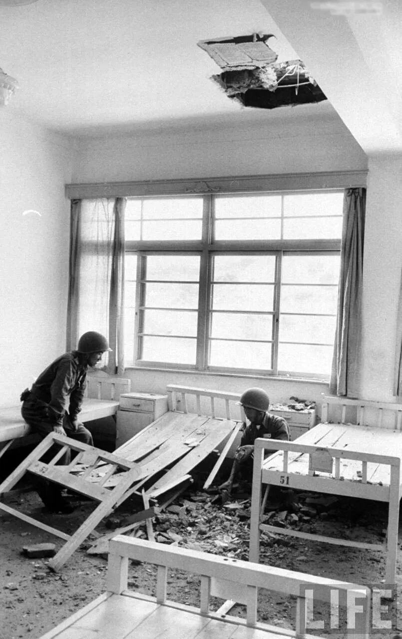 国军军官站在被共军炮弹炸开了大洞的房间里,墙上的国父孙中山的画像毫发未损。