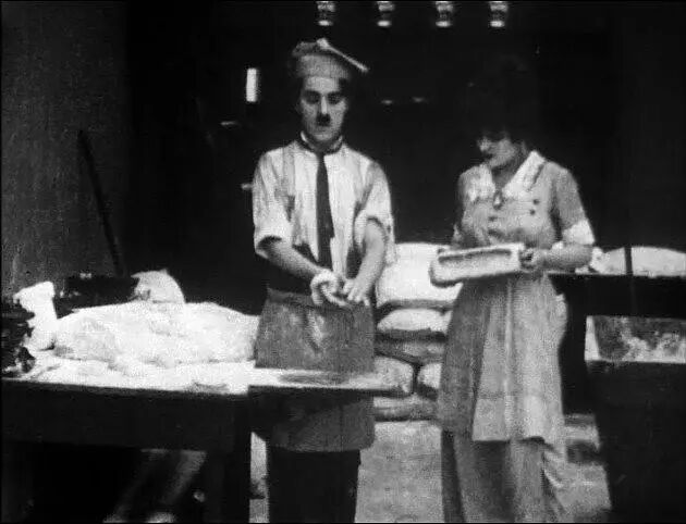 卓别林当时24岁,随英国卡尔诺哑剧团到美国巡演时被麦克·塞纳特发掘进入电影圈。塞纳特创立的启斯东电影公司主推追逐扑跌、扔掷物件的打闹喜剧。所以卓别林早期的流浪汉形象很多都是野蛮的闯祸精。疯狂追捕的警察、引起争执的美女,再加夏尔洛这个流浪汉,是卓别林在启斯东拍摄电影的标配。其中最卖座的短片《面包和炸药》,几乎从头到尾都充斥着粗鲁的打闹画面。但即使是面对这种模式化的叙事,卓别林依然会找到独具个人特色的小点缀,比如短片中把面团套在手上做甜甜圈的桥段,便是观众所前所未见的。