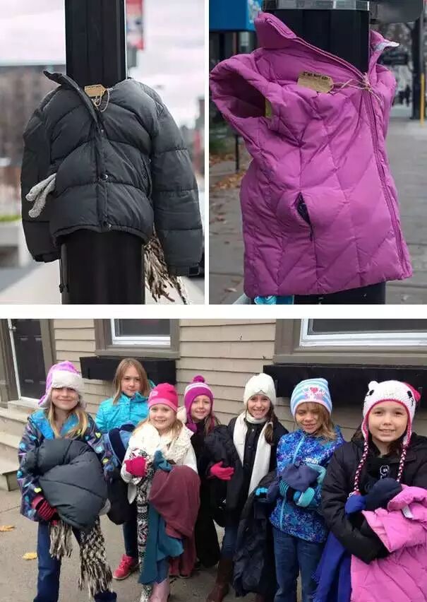 12、这些加拿大的孩子,把厚衣服穿在路边柱子上,让无家可归的流浪者自己取用,以渡过这个冬天。