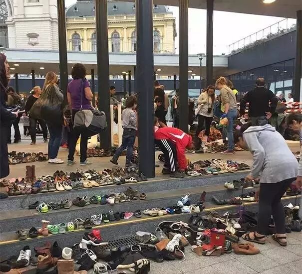 15、为了帮助刚到达的移民,匈牙利的老百姓把捐出的鞋子送到布达佩斯火车站。