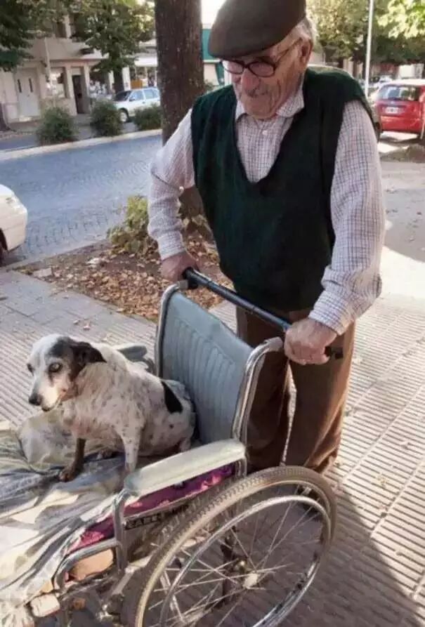 7、这只狗已经老得走不动了,他的主人每天用轮椅推它出来散步。