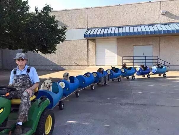 20、一位80岁的老人自制小火车,带着他收留的流浪狗。