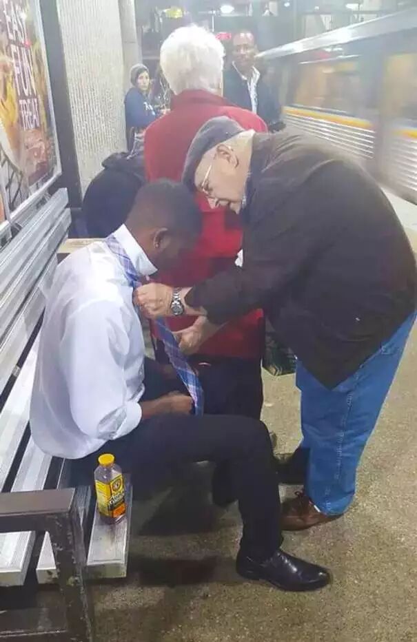 9、地铁站上,一位也许是着急去面试的年轻人,怎么也弄不好他的领带。一位过路的老人毫不犹豫地上前,一步一步教他怎样系领带。