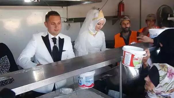 3、一对土耳其新婚夫妇,用他们的婚宴,为4000位难民提供了一顿可口的饭。