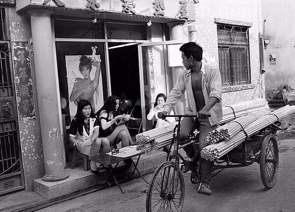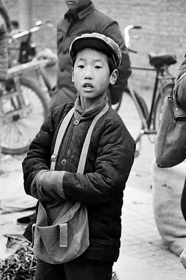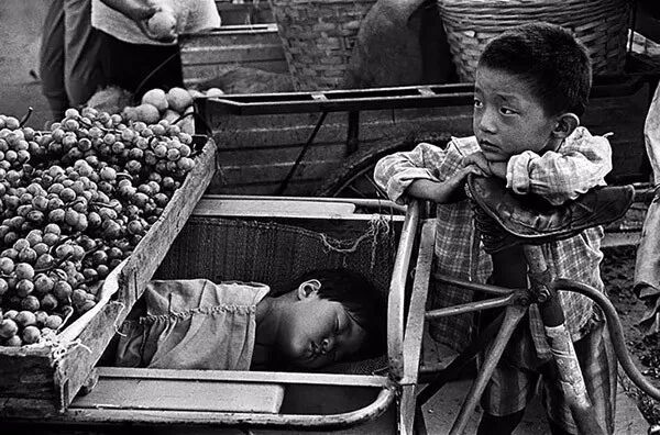1995年,河南,早市上卖葡萄的兄妹俩。