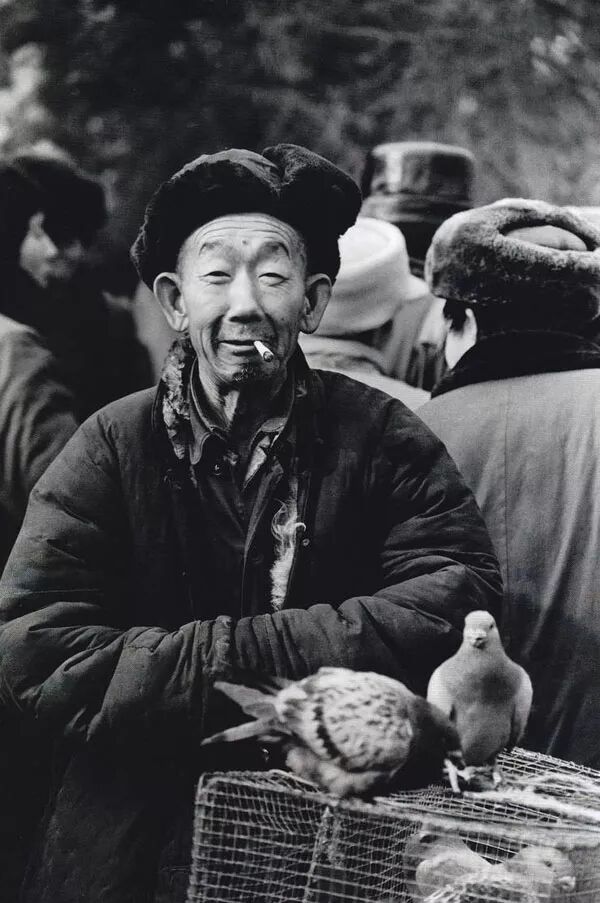 1978年,北京龙潭湖鸟市,老人和他的鸽子。
