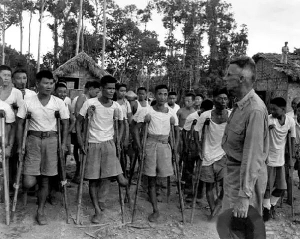 1944年7月15日,在沿列多公路某处的康复营地里,史迪威将军脱帽对着一群中国退伍军人讲话。