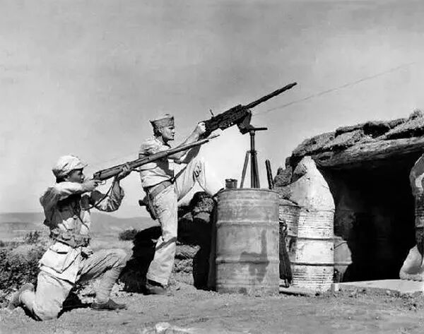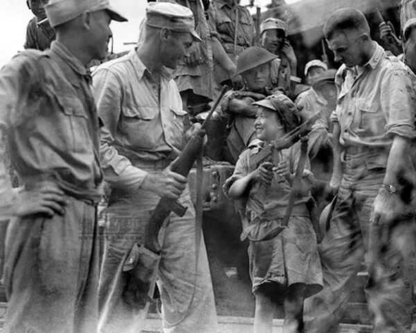美军联络官声称他曾经站立起身连续向日军投掷了两整箱手榴弹,为自己创造了毙伤日军的纪录。此刻,他正向两名美军联络官夸奖他的汤姆式冲锋枪。