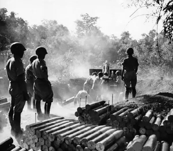 1944年12月11日,缅甸巴莫,剩余的顽固日军正在遭受第三野战炮营第九小组的轰击。操作这些武器的正是受过美军训练的中国军队。