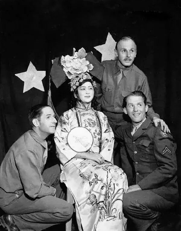 美国士兵与一个展示中国服饰的模特。照片大约拍摄于1944年左右。
