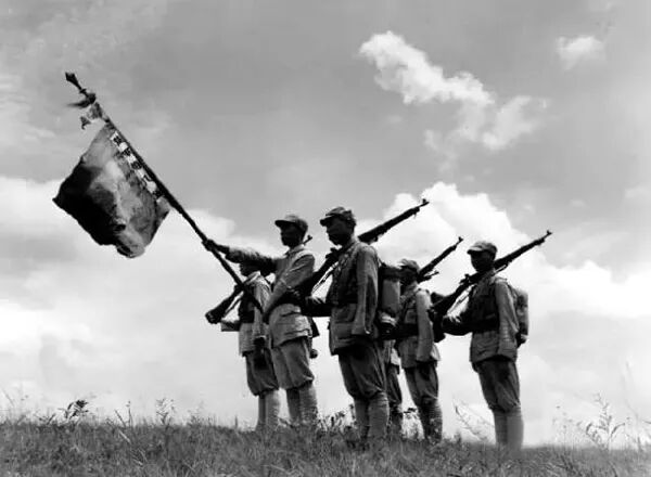 1945年8月8日,广西南宁,一名标准团旗手站立在一座山顶上,身边由一队强壮的卫兵守护。劳埃德·琼斯/摄。