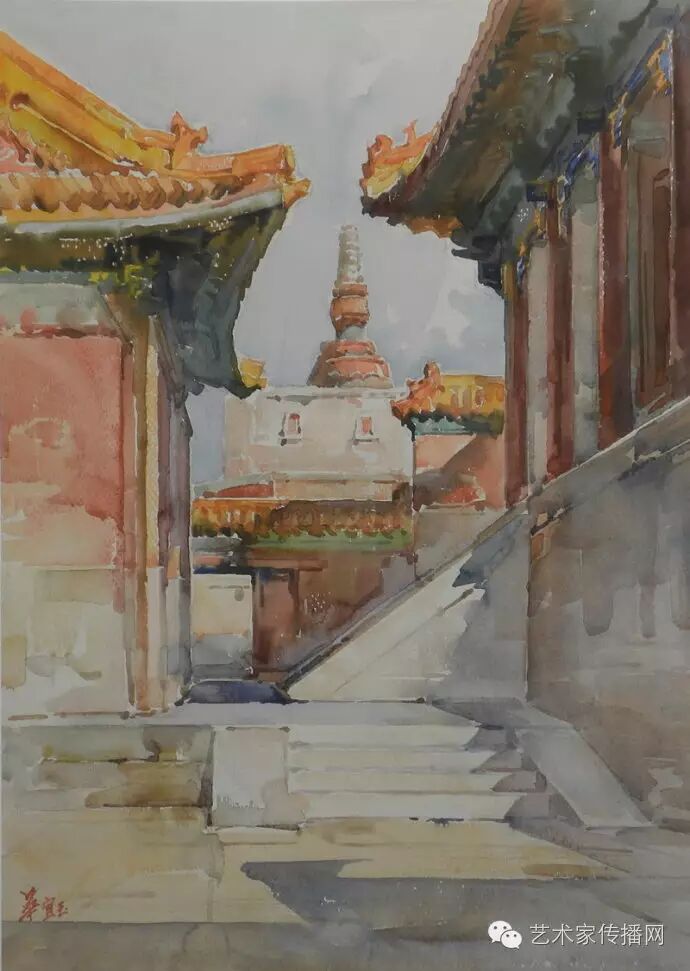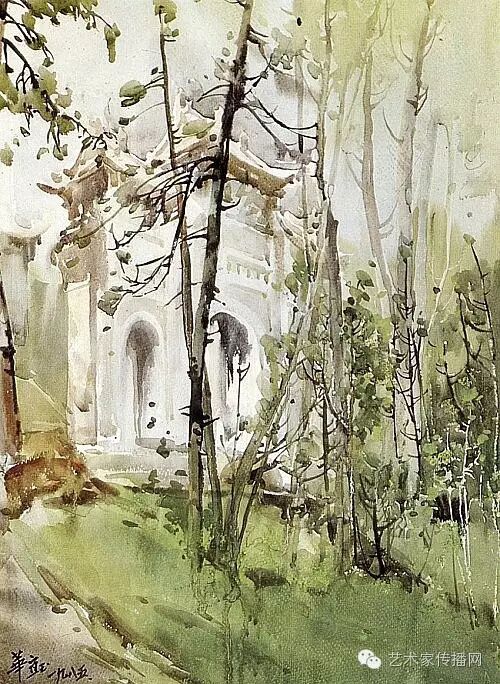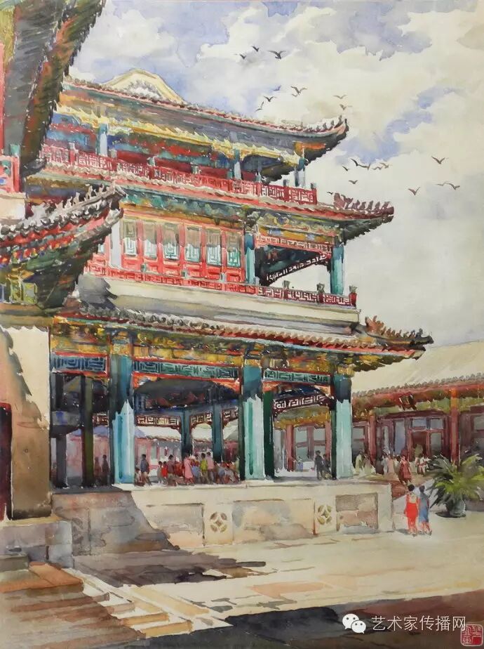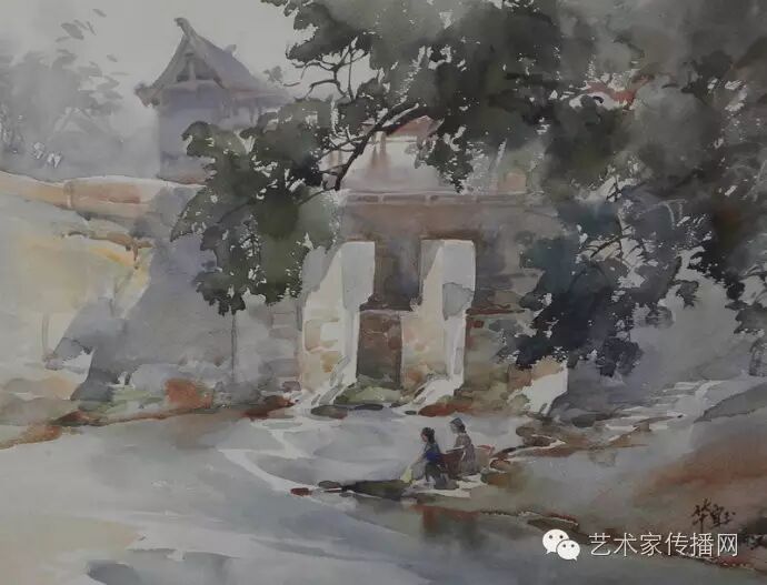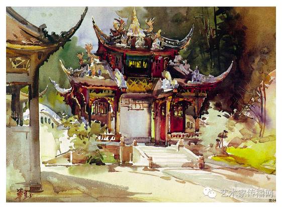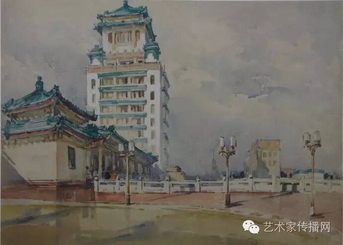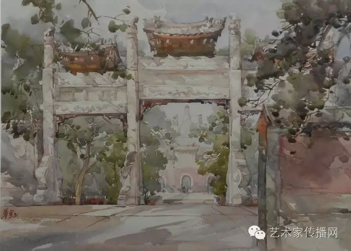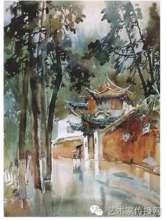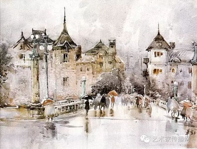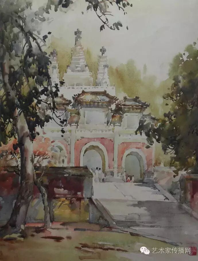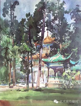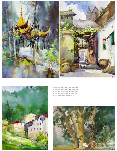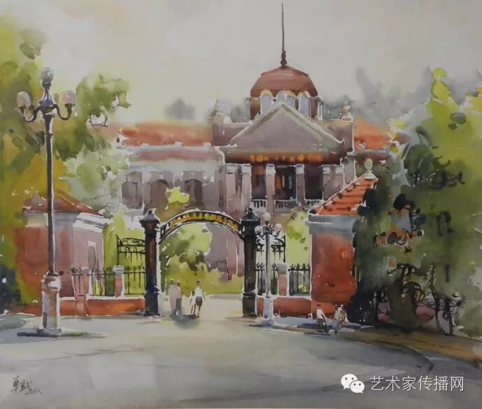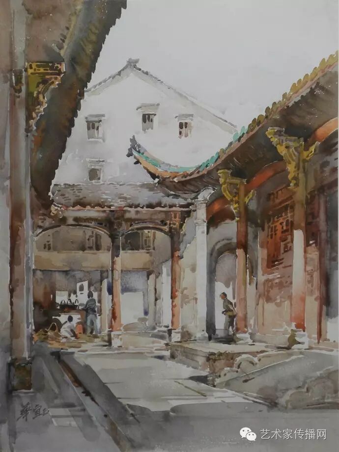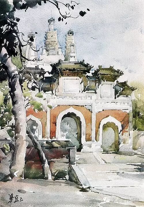 华宜玉的建筑水彩画,强调表现建筑物的严谨结构,色彩表现的鲜明洒脱,笔触运用的坚实有力,水分运用的渗化多变,使建筑主体置于协调的幽美环境之中,既是建筑水彩画,又是高雅的水彩艺术。