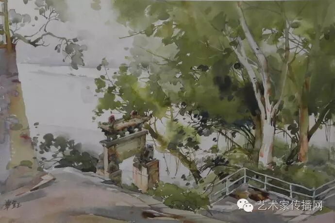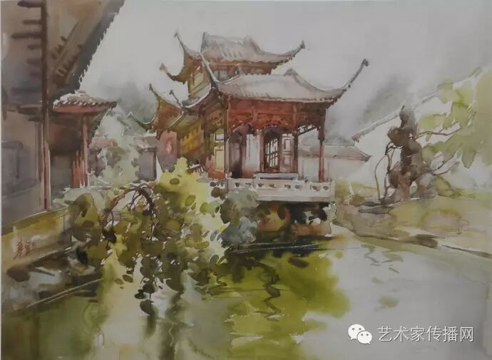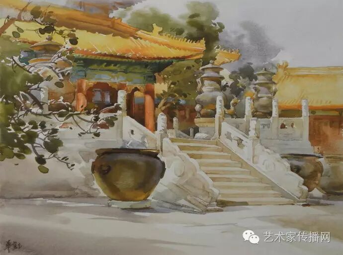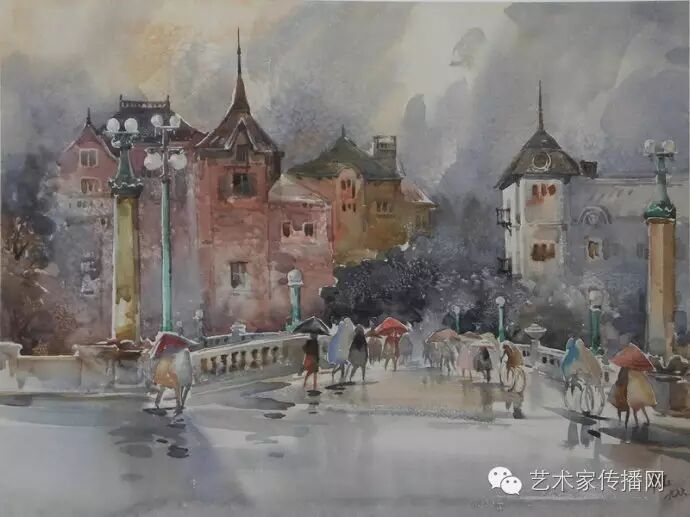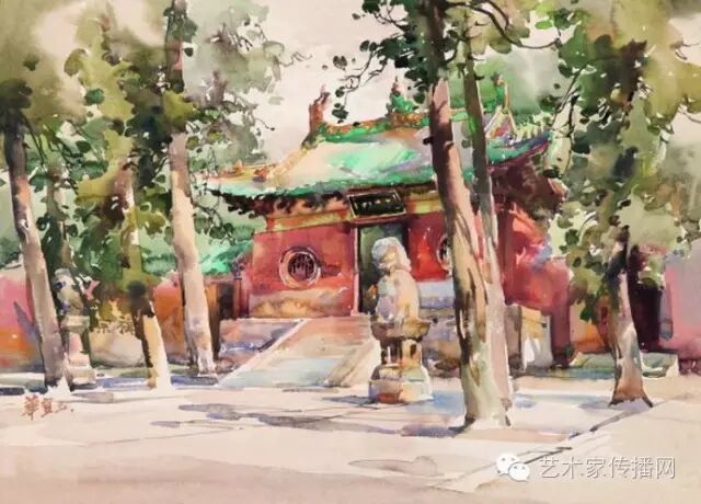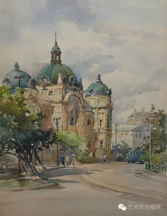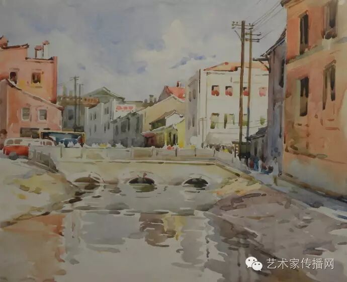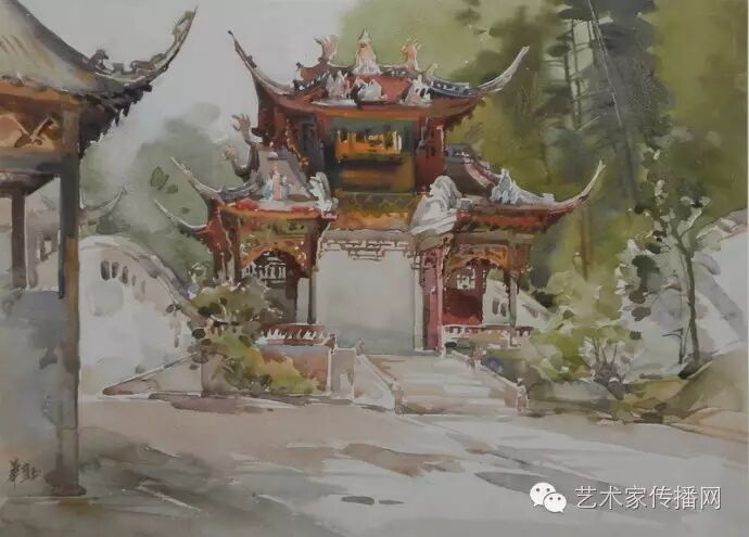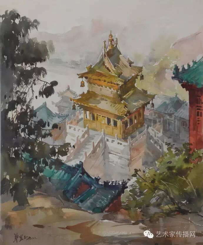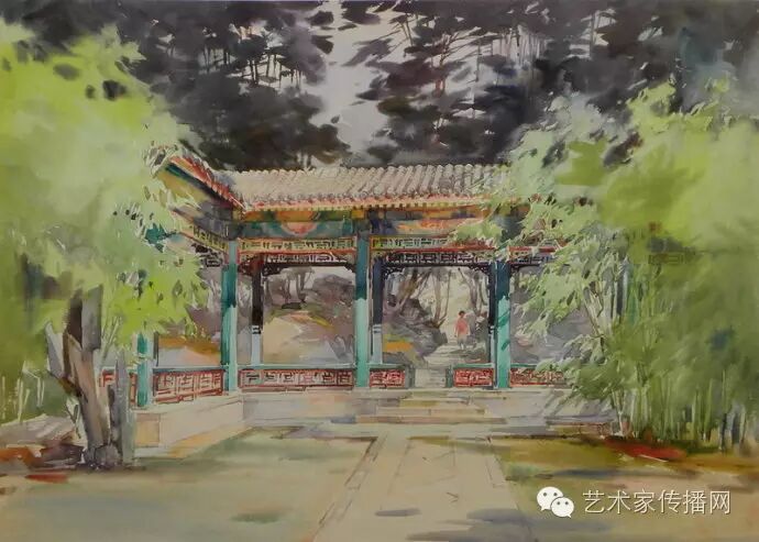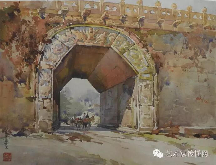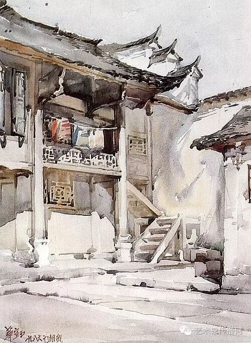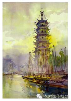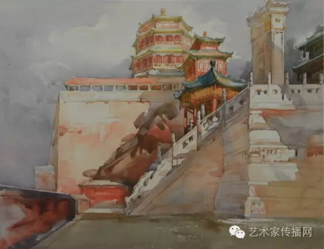 华宜玉的建筑水彩画,强调表现建筑物的严谨结构,色彩表现的鲜明洒脱,笔触运用的坚实有力,水分运用的渗化多变,使建筑主体置于协调的幽美环境之中,既是建筑水彩画,又是高雅的水彩艺术。