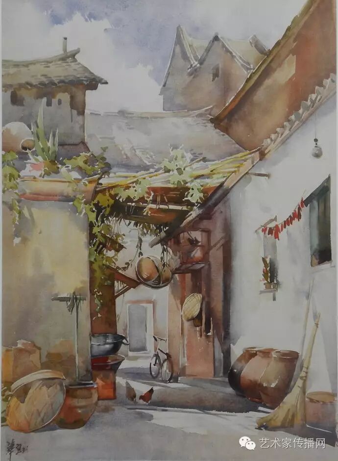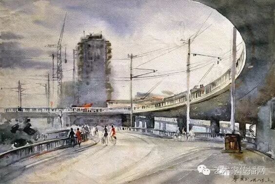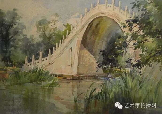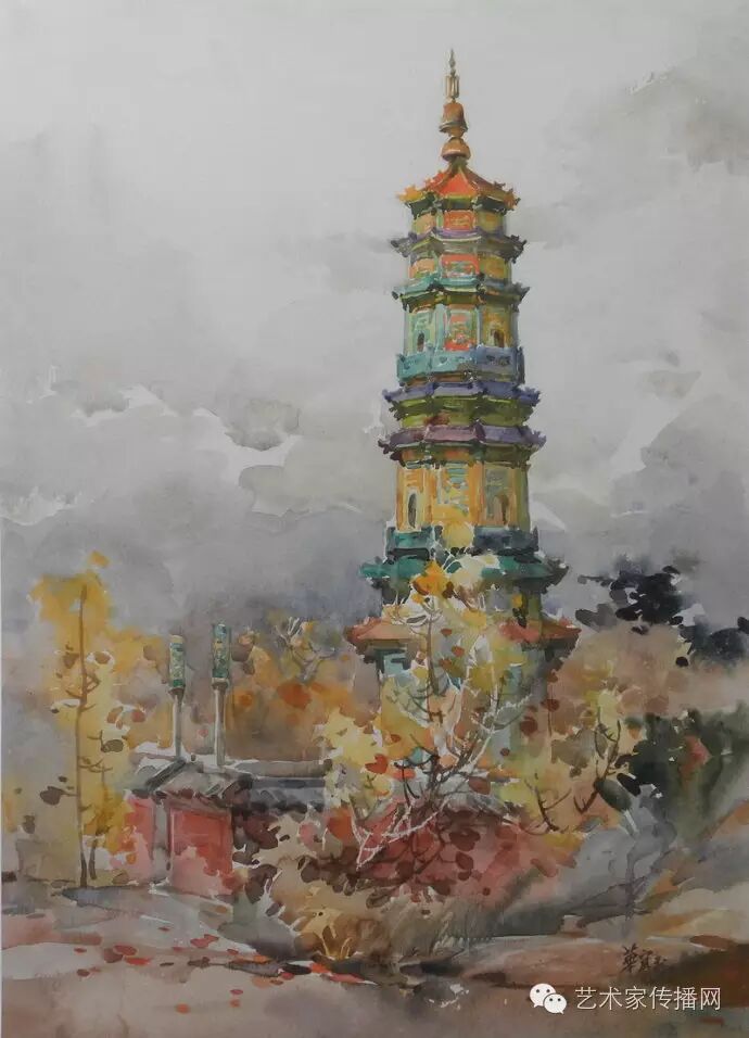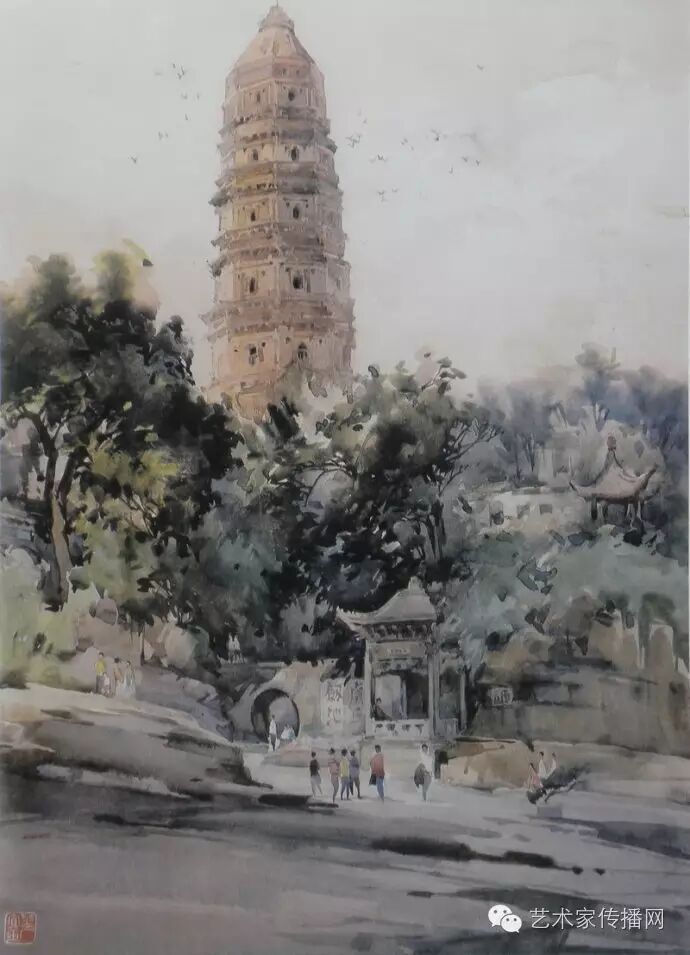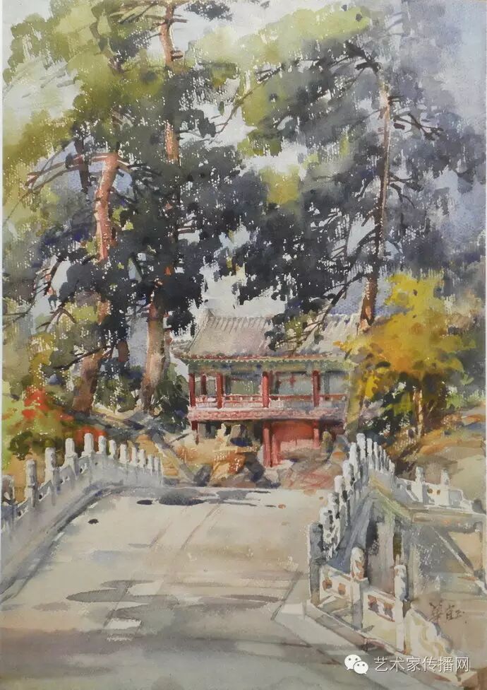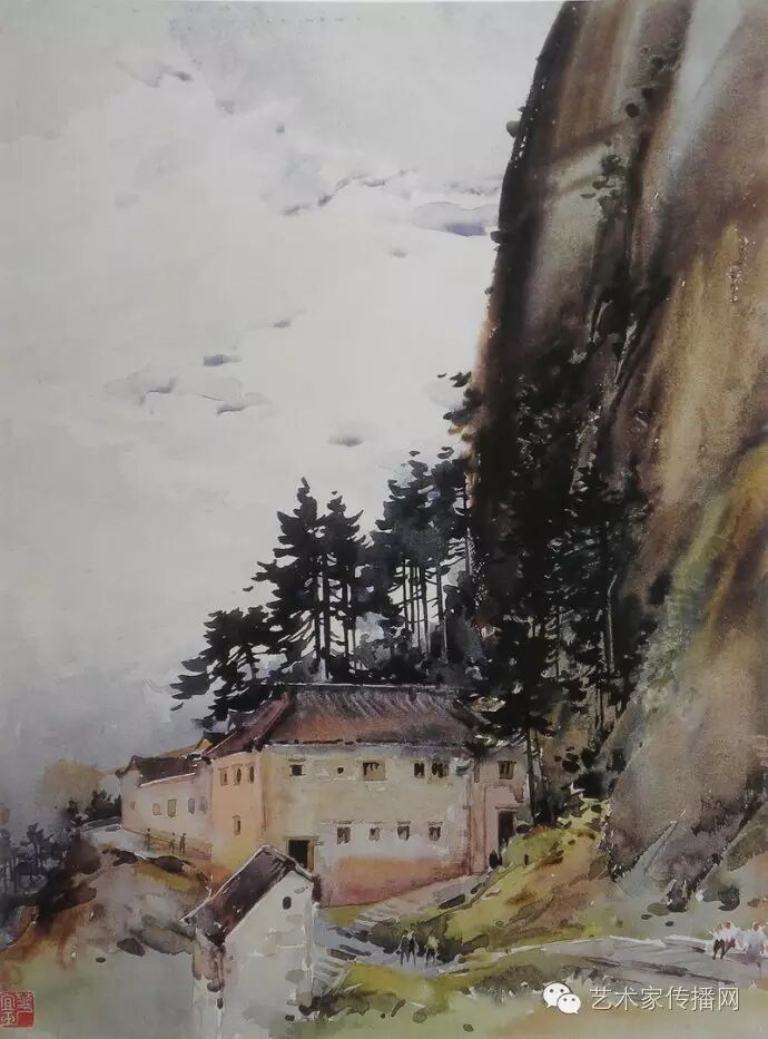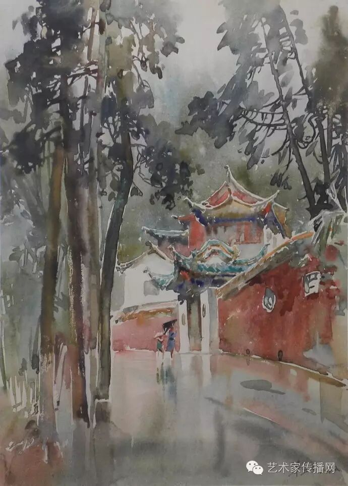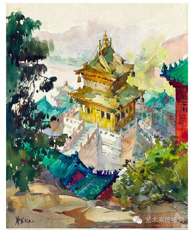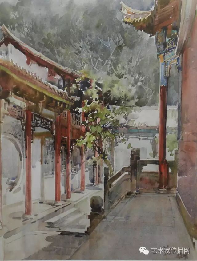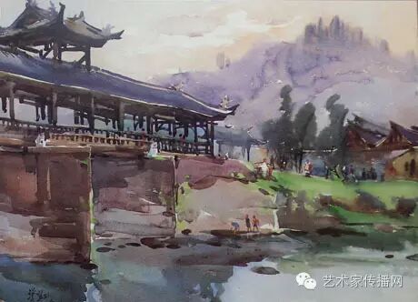 华宜玉的建筑水彩画,强调表现建筑物的严谨结构,色彩表现的鲜明洒脱,笔触运用的坚实有力,水分运用的渗化多变,使建筑主体置于协调的幽美环境之中,既是建筑水彩画,又是高雅的水彩艺术。