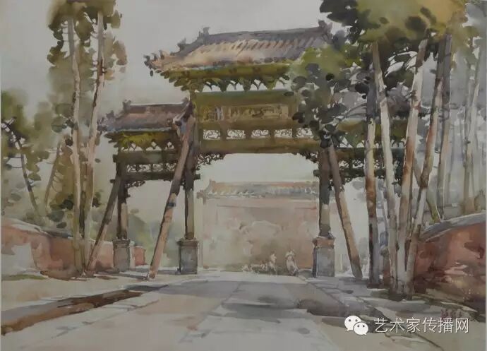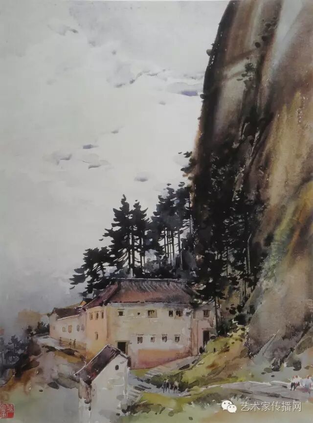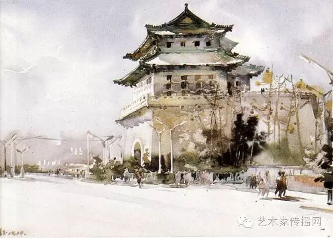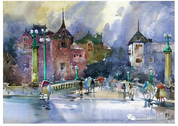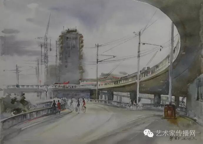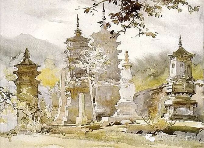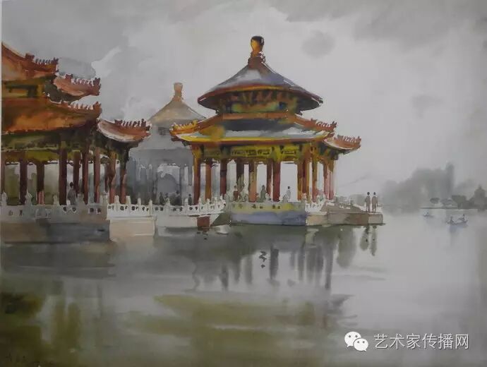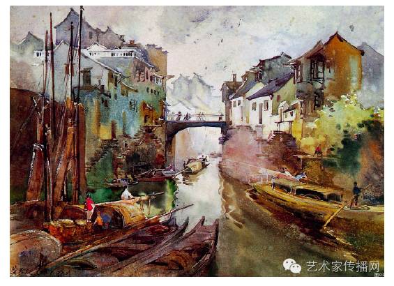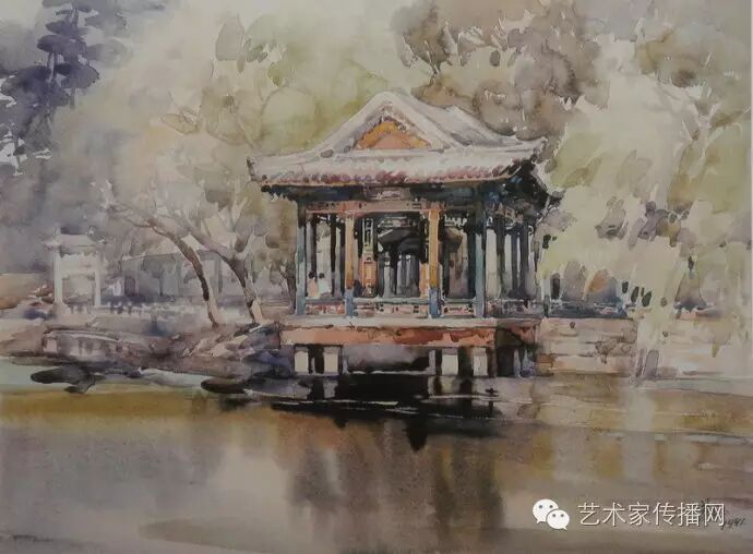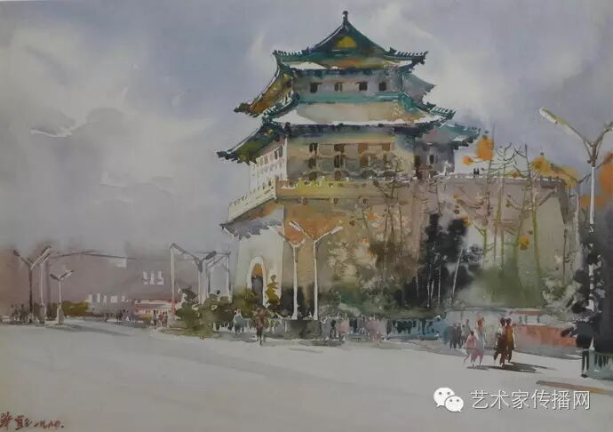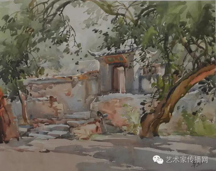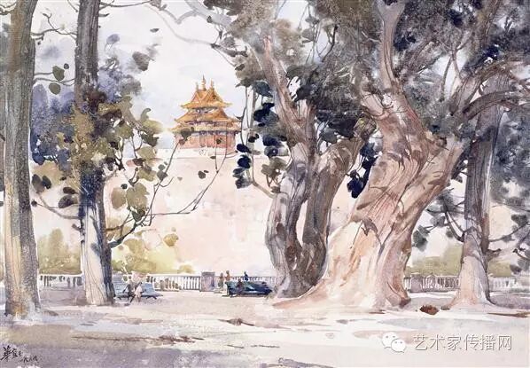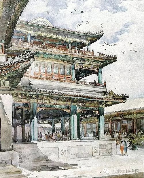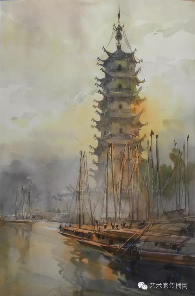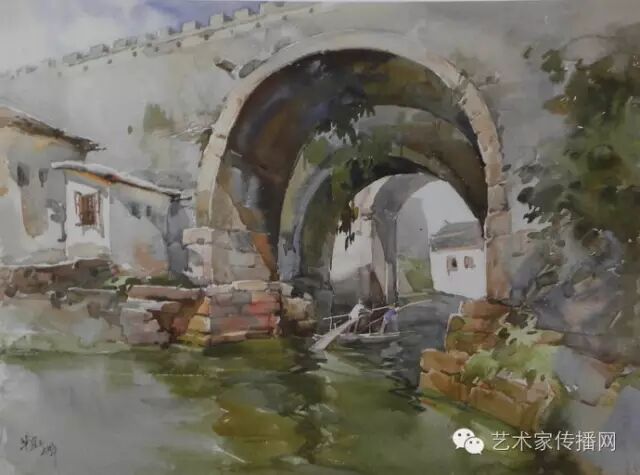 华宜玉的建筑水彩画,强调表现建筑物的严谨结构,色彩表现的鲜明洒脱,笔触运用的坚实有力,水分运用的渗化多变,使建筑主体置于协调的幽美环境之中,既是建筑水彩画,又是高雅的水彩艺术。