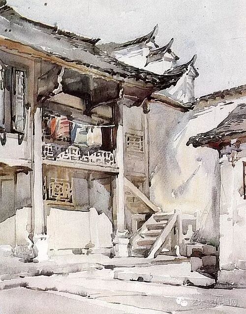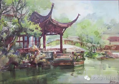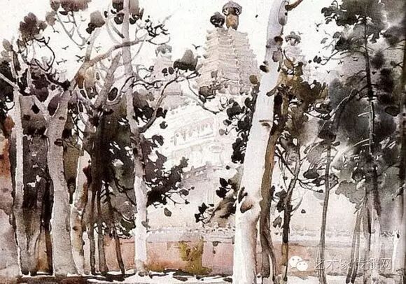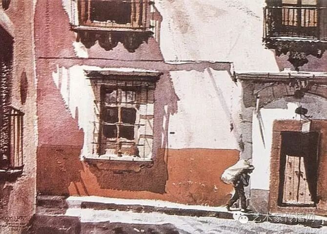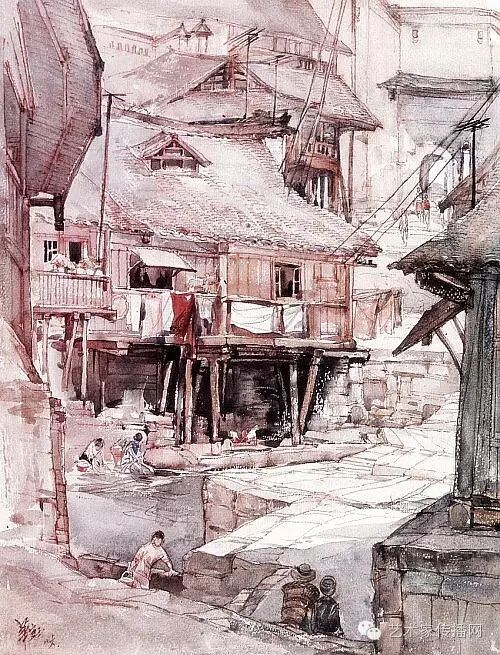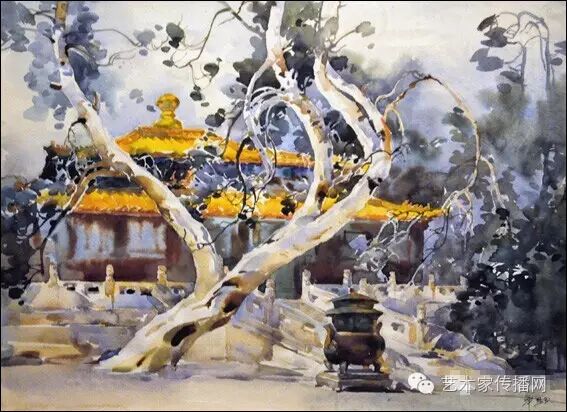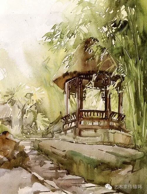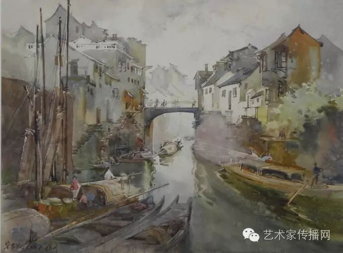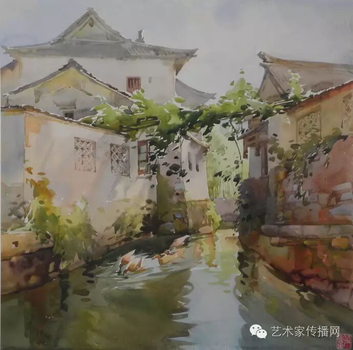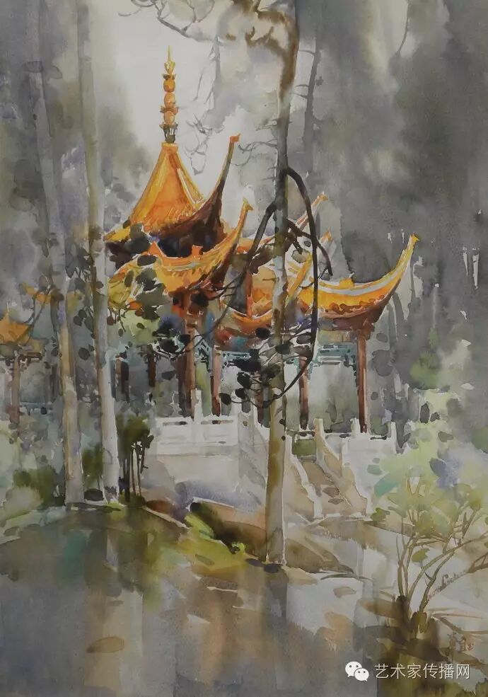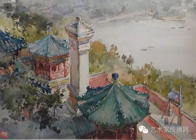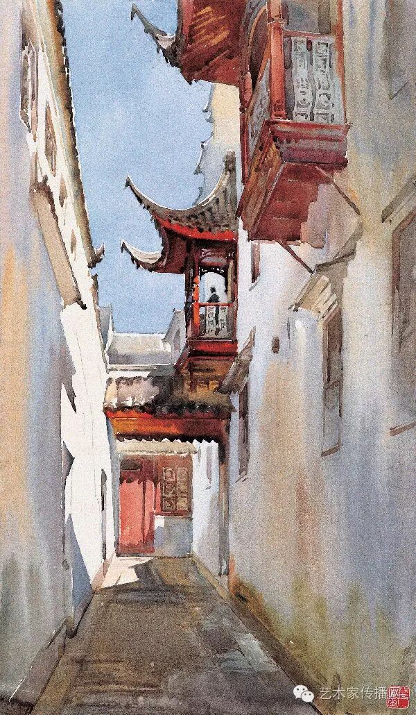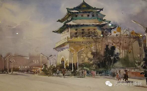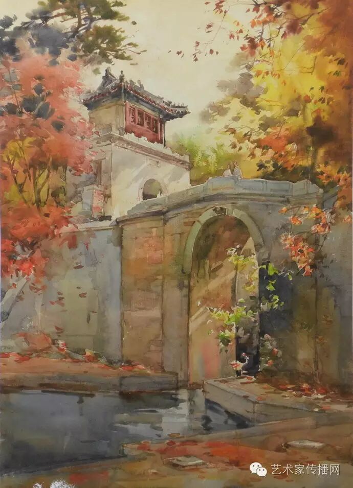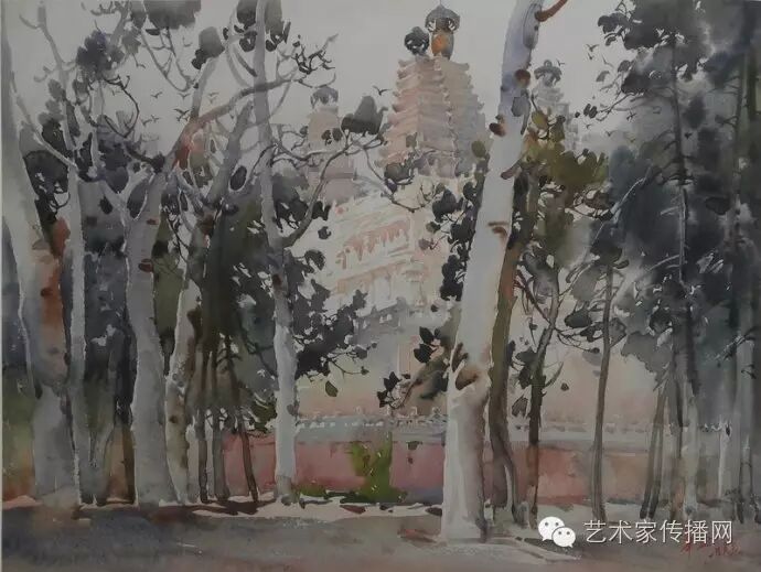 华宜玉的建筑水彩画,强调表现建筑物的严谨结构,色彩表现的鲜明洒脱,笔触运用的坚实有力,水分运用的渗化多变,使建筑主体置于协调的幽美环境之中,既是建筑水彩画,又是高雅的水彩艺术。