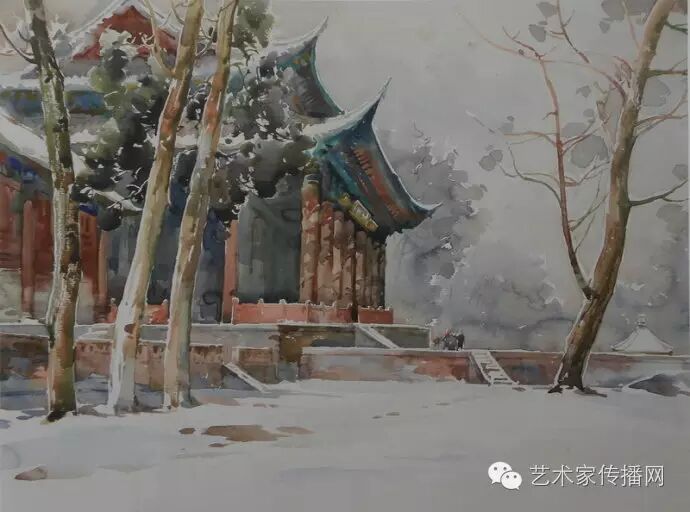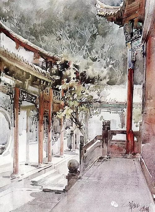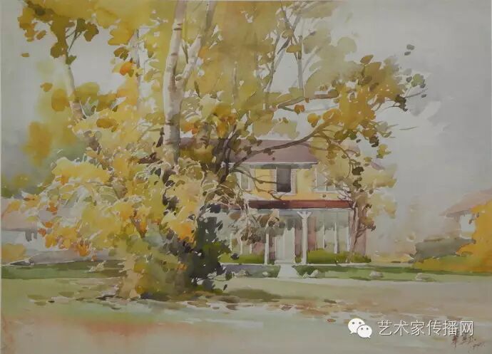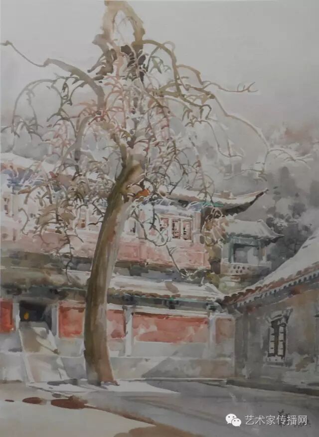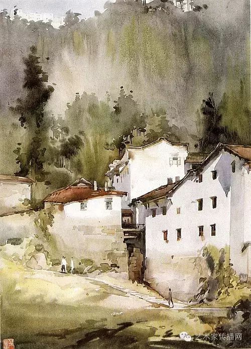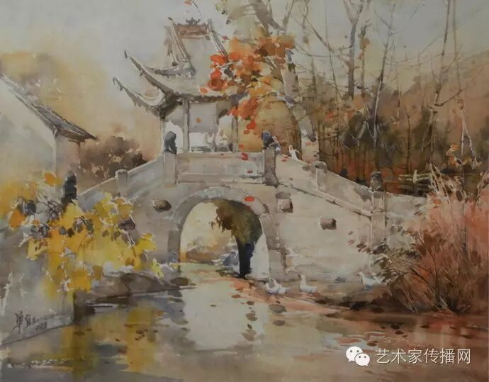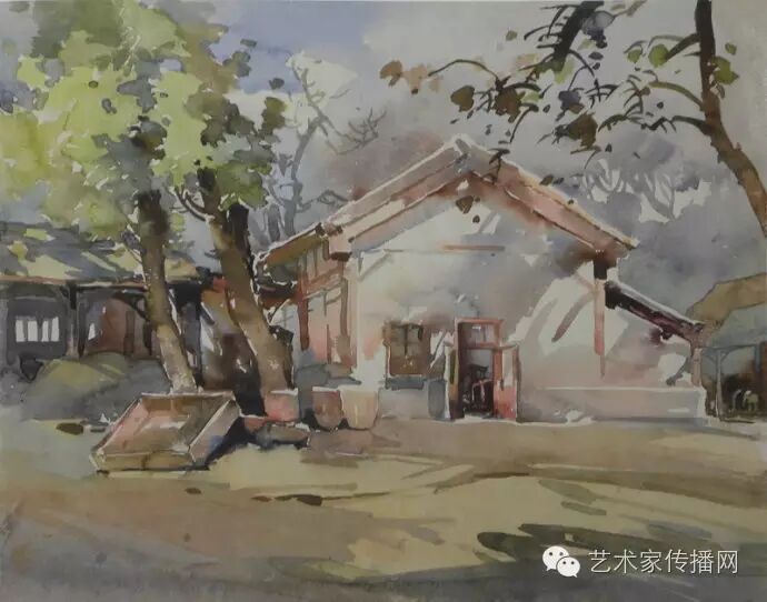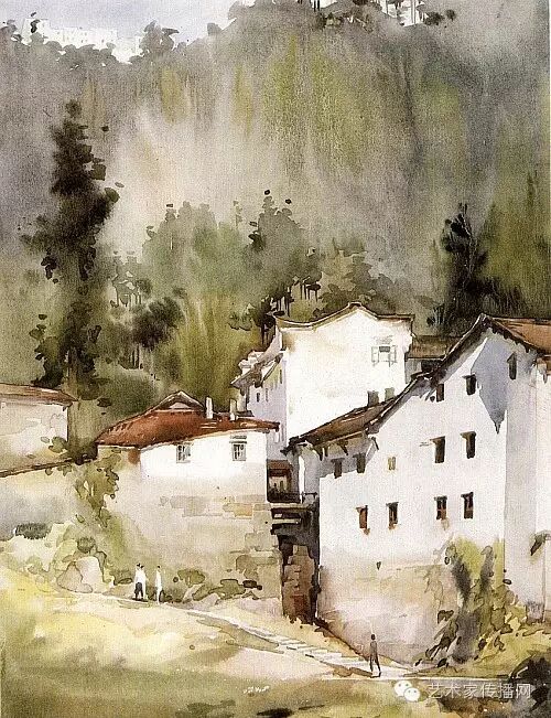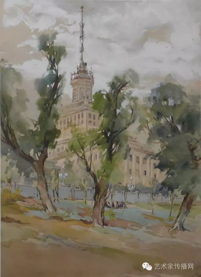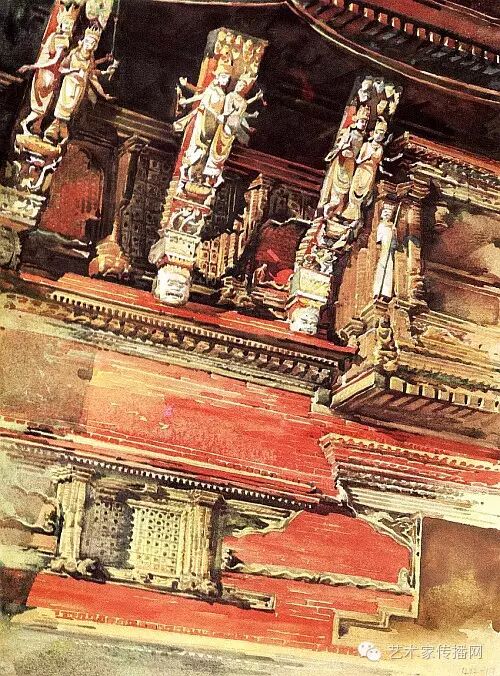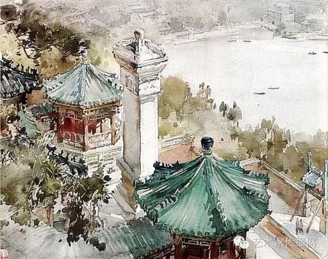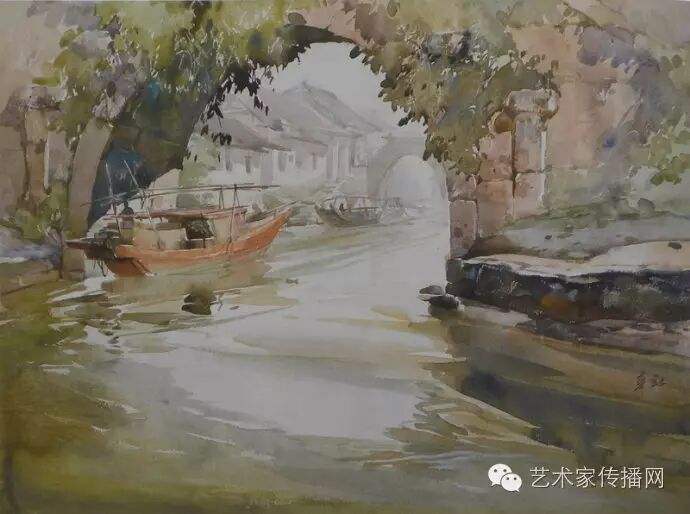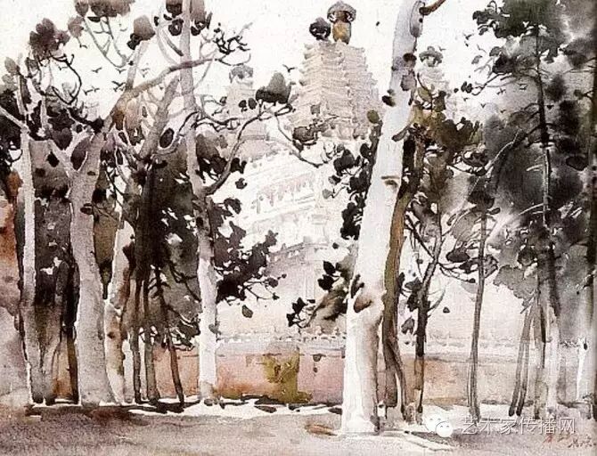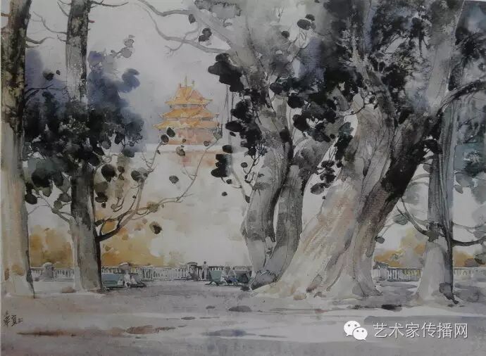 华宜玉的建筑水彩画,强调表现建筑物的严谨结构,色彩表现的鲜明洒脱,笔触运用的坚实有力,水分运用的渗化多变,使建筑主体置于协调的幽美环境之中,既是建筑水彩画,又是高雅的水彩艺术。