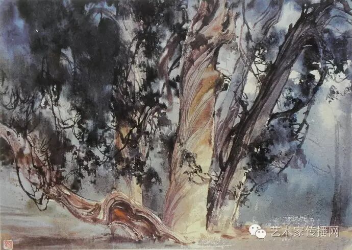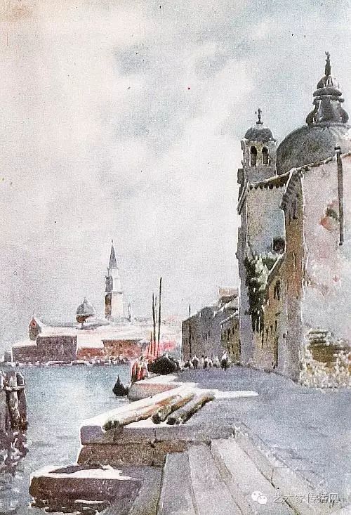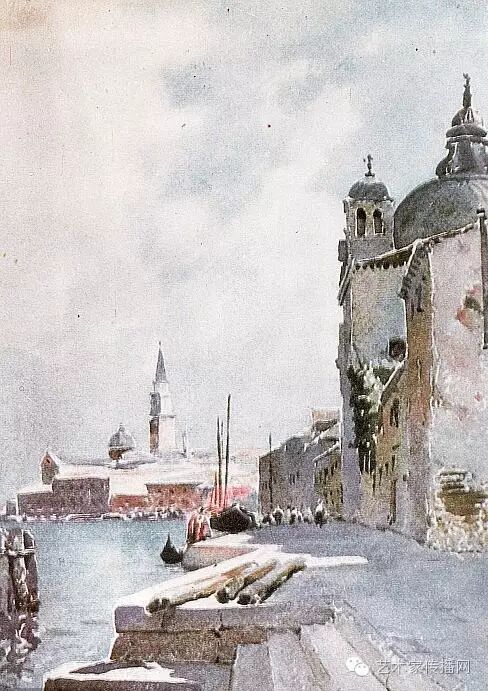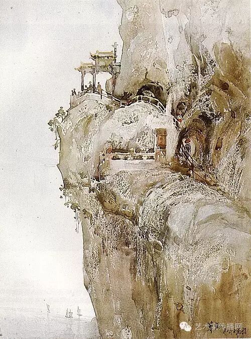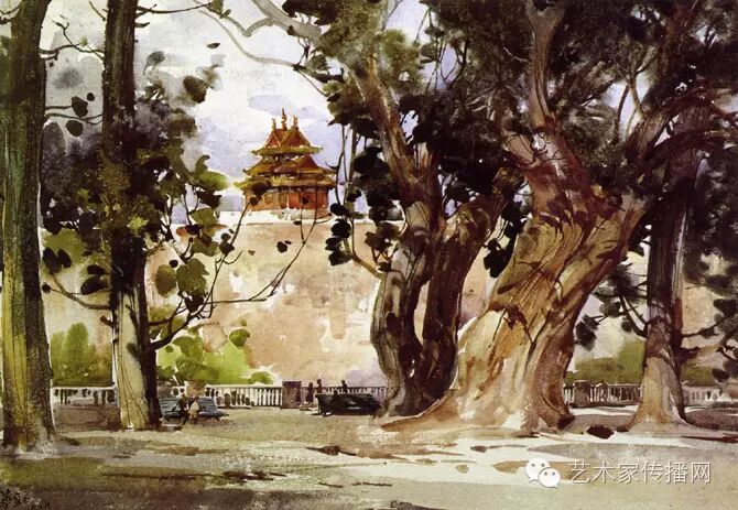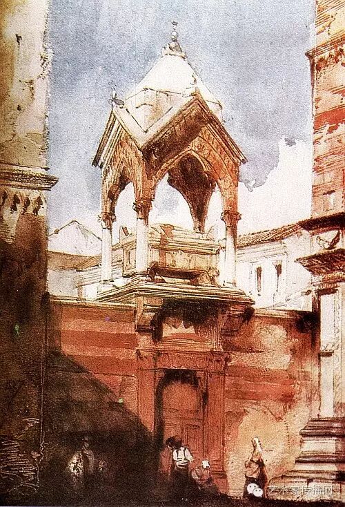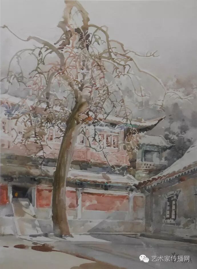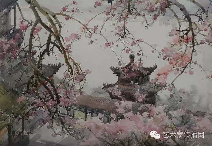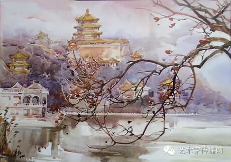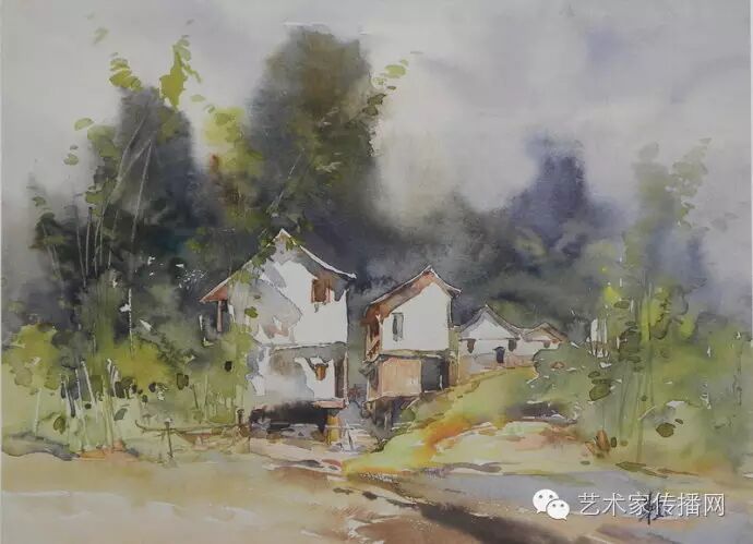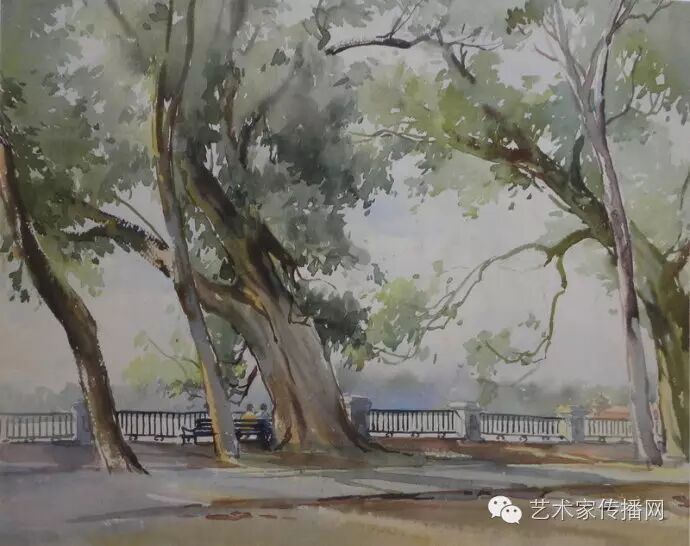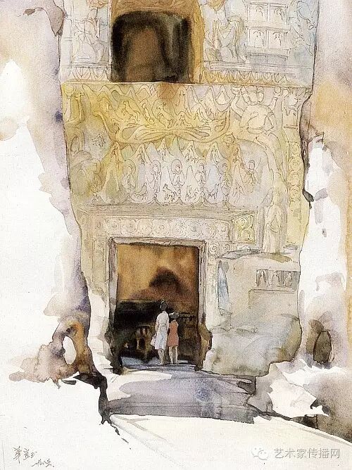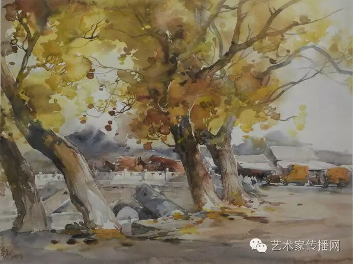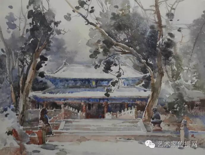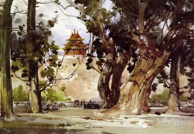 华宜玉的建筑水彩画,强调表现建筑物的严谨结构,色彩表现的鲜明洒脱,笔触运用的坚实有力,水分运用的渗化多变,使建筑主体置于协调的幽美环境之中,既是建筑水彩画,又是高雅的水彩艺术。
