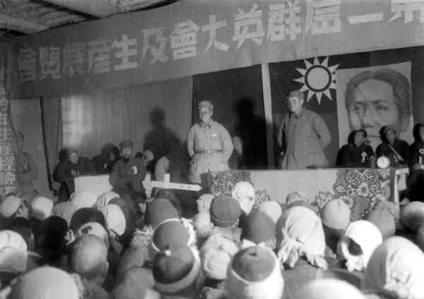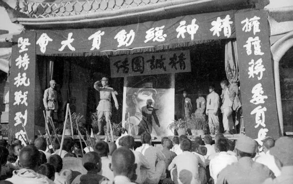 1939年8月,边区国民"精神总动员大会",中间的画像是蒋介石。沙飞/摄。