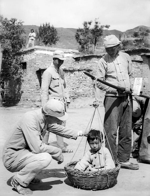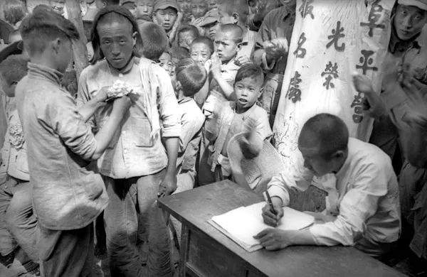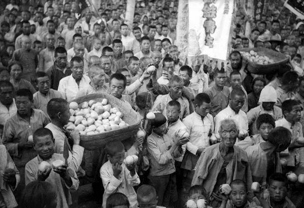 1939年6月, 河北阜平一区参军大会上给参军青年家属发馒头。沙飞/摄。
