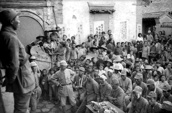 1939年5月,八路军120师359旅五台山战斗中俘敌若干名,遣返时王震旅长对日俘谈话。沙飞/摄。