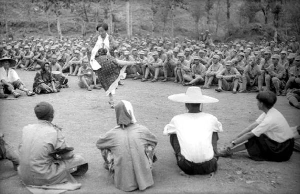 1939年5月,八路军120师359旅五台山战斗后遣返俘虏,日俘唱歌表示感谢。沙飞/摄。