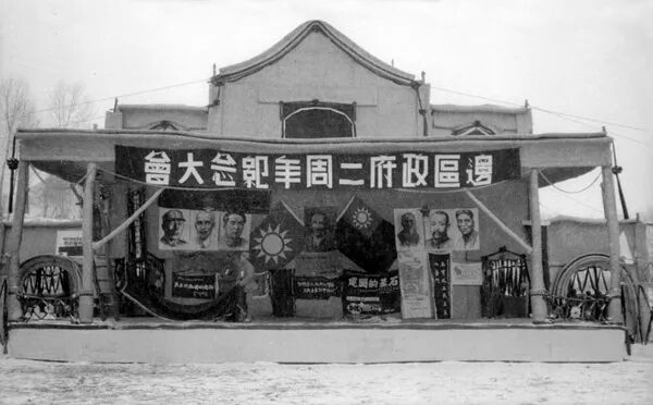 1940年,晋察冀边区政府二周年纪念大会。画像左起聂荣臻、蒋介石、毛泽东、孙中山等。沙飞/摄。