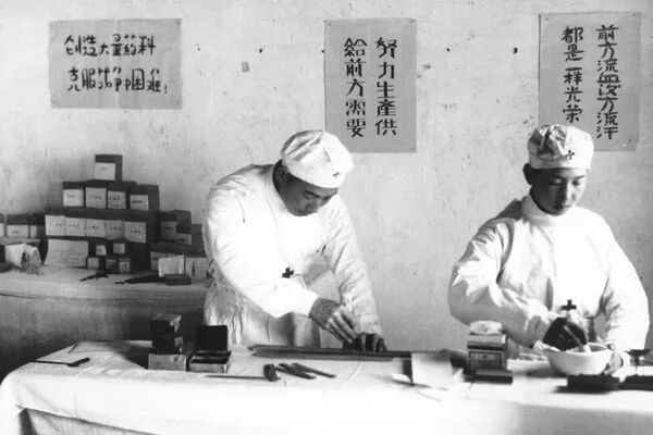 1944年,河北省唐县白求恩国际和平医院,给伤病员换药。沙飞/摄。