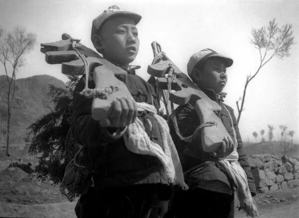 1942年2月,光荣花戴在胸,一心要当八路军。河北平山县南庄的刘梦元(左),刘汉兴(中)参军。沙飞/摄。