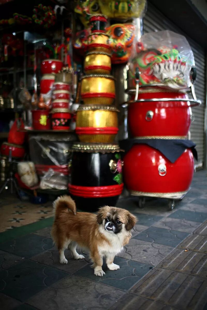 大新路相公巷,鼓乐一条街。狗狗有点愁眉苦脸,肯定是整天看着这么多面目狰狞的醒狮,每晚发恶梦。
