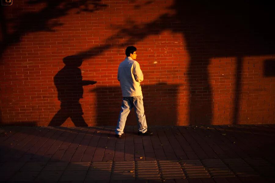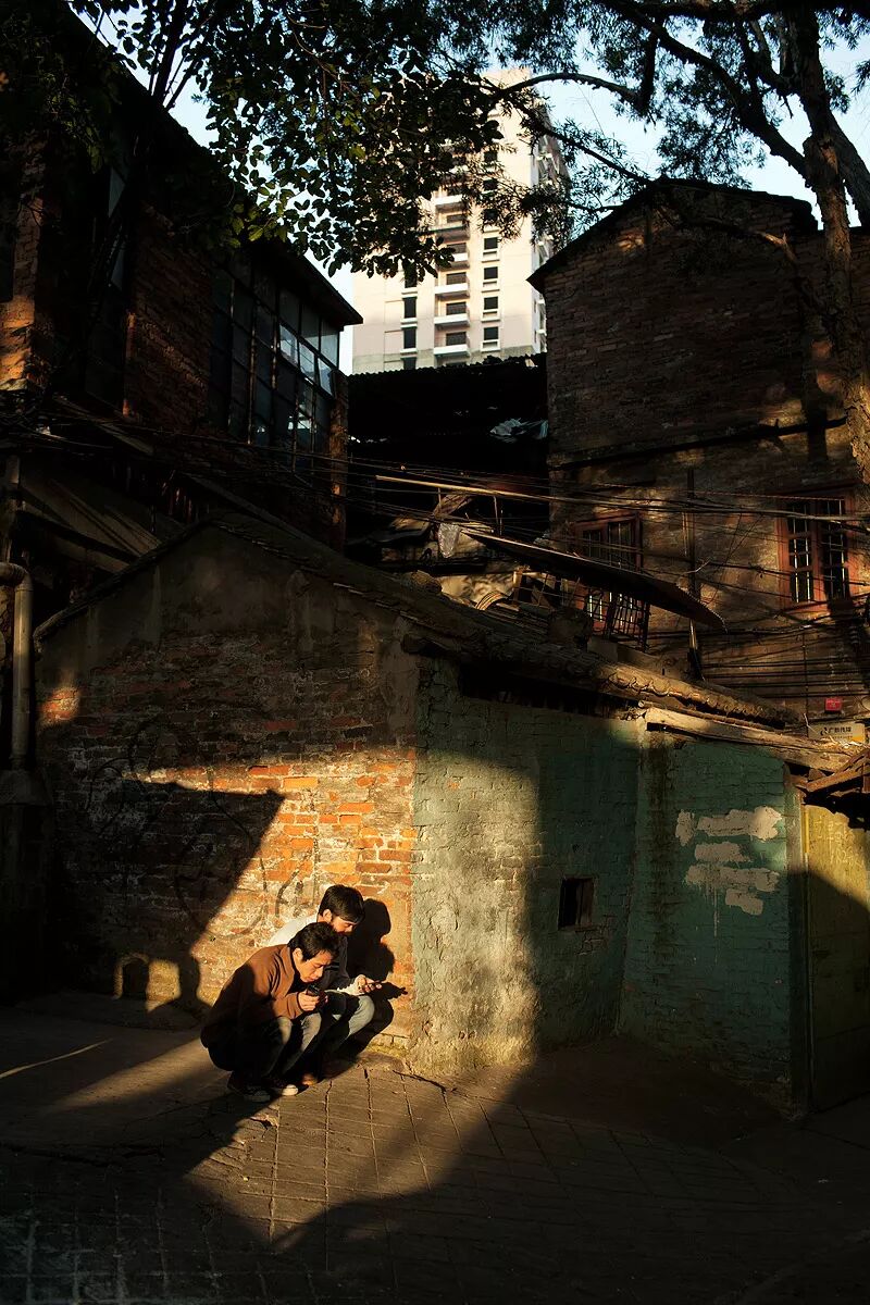 荔湾路,粥粉面店的小工蹲在夕阳里,用手机打发时光。不知道是不是在转发:身体和心灵,总有一个在路上。
