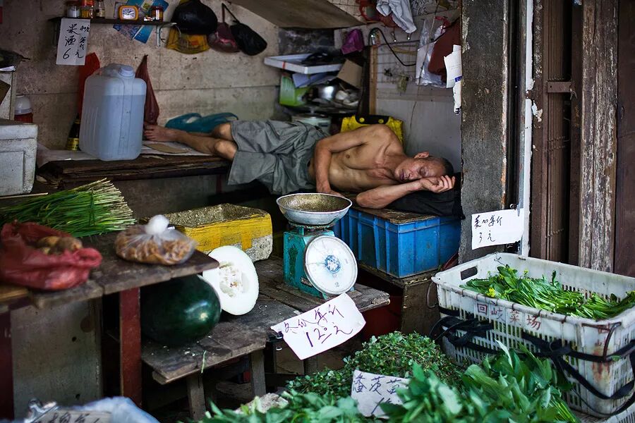 珠光市场,天热地辣,买菜的阿叔都顶不住,要小睡一下。