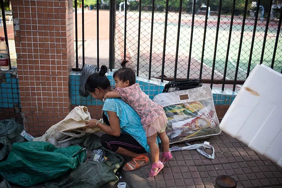 珠江新城,一所名牌小学的围墙外。小姑娘抱着收废品的妈妈玩耍。按照政策,她没有资格上这所学校。
